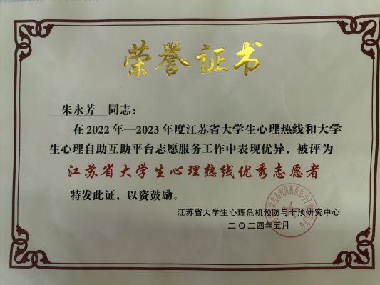 近日,2022年-2023年度江苏省大学生心理热线优秀志愿者表彰仪式在江苏省大学生心理危机预防与干预研究中心(南京审计大学)举行。大会表彰了15位江苏省大学生心理热线优秀志愿者,我校学工处心理健康中心朱永芳老师获评“江苏省大学生心理热线优秀志愿者”。江苏省大学生心理热线是一条经江苏省教育厅批复开通,于2019年10月正式启用的面向全省在校大学生提供24小时免费心理咨询服务的公益热线,是开展大学生心理健康教育、...