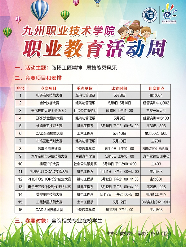 各系(院)、有关部门: 根据《关于举办2017年“职业教育活动周”系列活动的通知》(九州〔2017〕17号)要求,决定举行2017年“职业教育活动周”活动开幕式暨总结表彰大会,具体事项通知如下: 一、会议时间: 5月15日(星期一)上午9:00 二、会议地点:主南二多媒体教室 三、参会人员:有关院领导、各系院主任(院长)及组委会人员、分赛场有关人员、赛项有关专业教师、参赛学生代表(机电系30人、...