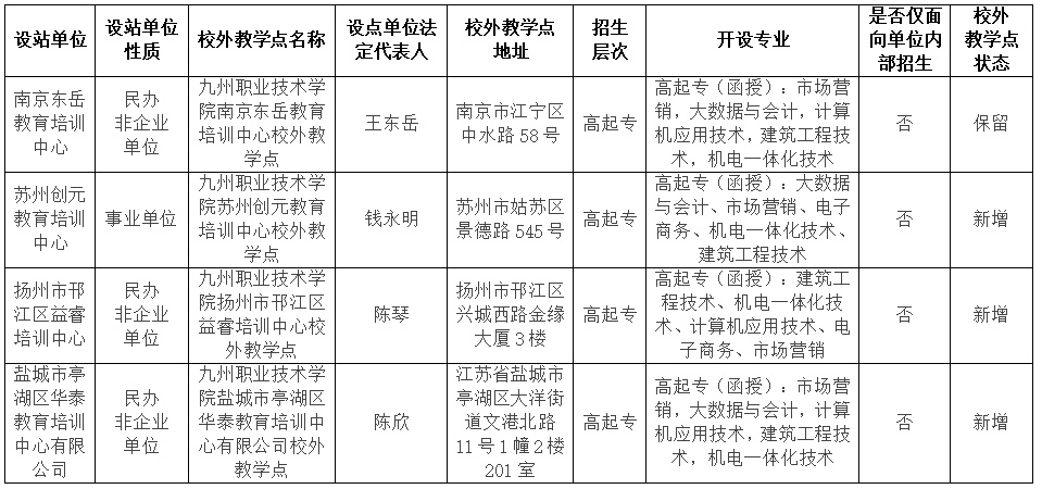 根据《省教育厅办公室关于开展高等学历继续教育自查和校外教学点备案工作的通知》(苏教办高函〔2022〕25号)文件精神,经站点申请,学院现场审核和考察,并经2023年1月3日学院党政联席会研究通过,拟保留和新增校外教学点如下表所示:如有异议请在公示期内以书面形式反馈至学院办公室。最终备案结果以江苏省教育厅公布的文件为准。公示期:2023年1月4日-2023年1月10日。联系地址:太阳成集团tyc234cc主楼912办公室。联系人:高梦晨...
