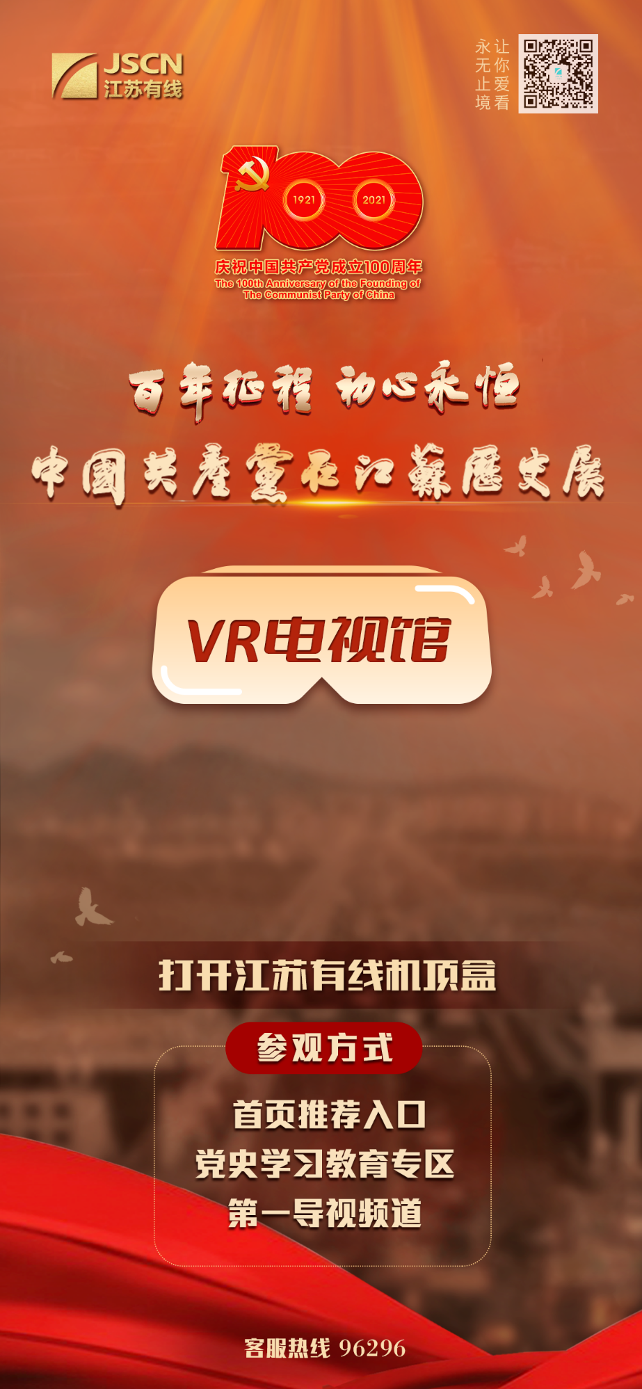 3、进入江苏有线电视机顶盒-首页--政务-党史学习教育专区,即可观看“百年征程 初心永恒——中国共产党在江苏历史展”VR电视馆展览轮播;点击宣传海报也可点播观看。