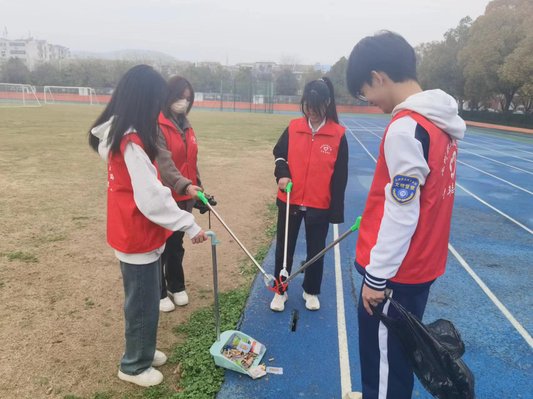 志愿者在学校操场进行清扫活动