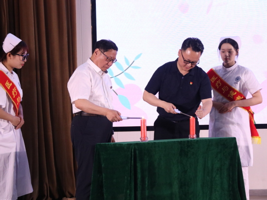 随后,副校长杜蜀宾和党委副书记张超共同为2022级护理专业学生代表点燃了象征南丁格尔精神的红烛,燃爱的光芒绽放着护理精神之光,引导着广大医学学子学习和发扬前辈“燃烧自己、照亮他人”的精神。