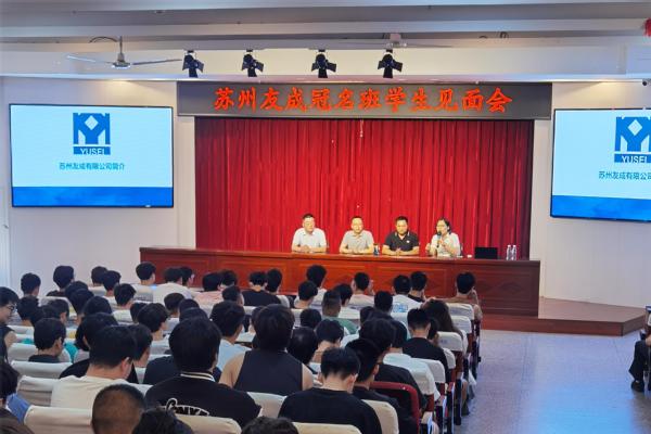 授牌仪式结束,校企双方在主南二报告厅召开苏州友成冠名班学生见面会。王德洪总经理向即将前往苏州友成机工有限公司实习的2022级机电、机制、电气专业同学们表示热烈欢迎,详细介绍了公司的经营理念、业务范围、品牌实力和员工发展等方面情况,具体说明了企业派驻技术人员入校开展实习前置教育、学生进入企业进行“轮岗学习——定岗培养——干部储备”的人才培养机制等方面内容,并与师生进行了现场交流互动。