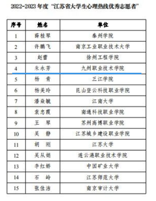 自热线开通以来,我校积极推荐优秀心理专职教师参与平台建设。朱永芳老师作为江苏省大学生心理热线的首批志愿者,主动参与志愿服务工作,锻炼实践业务能力,努力做学生心理健康的引导者、教育者和守护者。