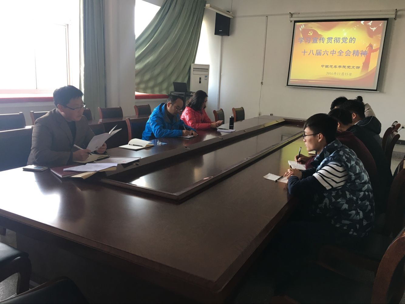 会议首先集体学习了十八届六中全会公报,随后进行了交流讨论。大家认为在当今和今后一个时期里,学习贯彻全会精神将是一项重大的政治任务,我们要结合开展“两学一做”学习教育,立足自身实际,力求学深学透、融会贯通,切实把思想和行动统一到全会精神上来,要通过学习活动,达到坚定共产主义信仰和宗旨意识,提升理论水平和认识水平,学以致用,推动教育教学工作的开展,进一步强化对学生的服务意识。