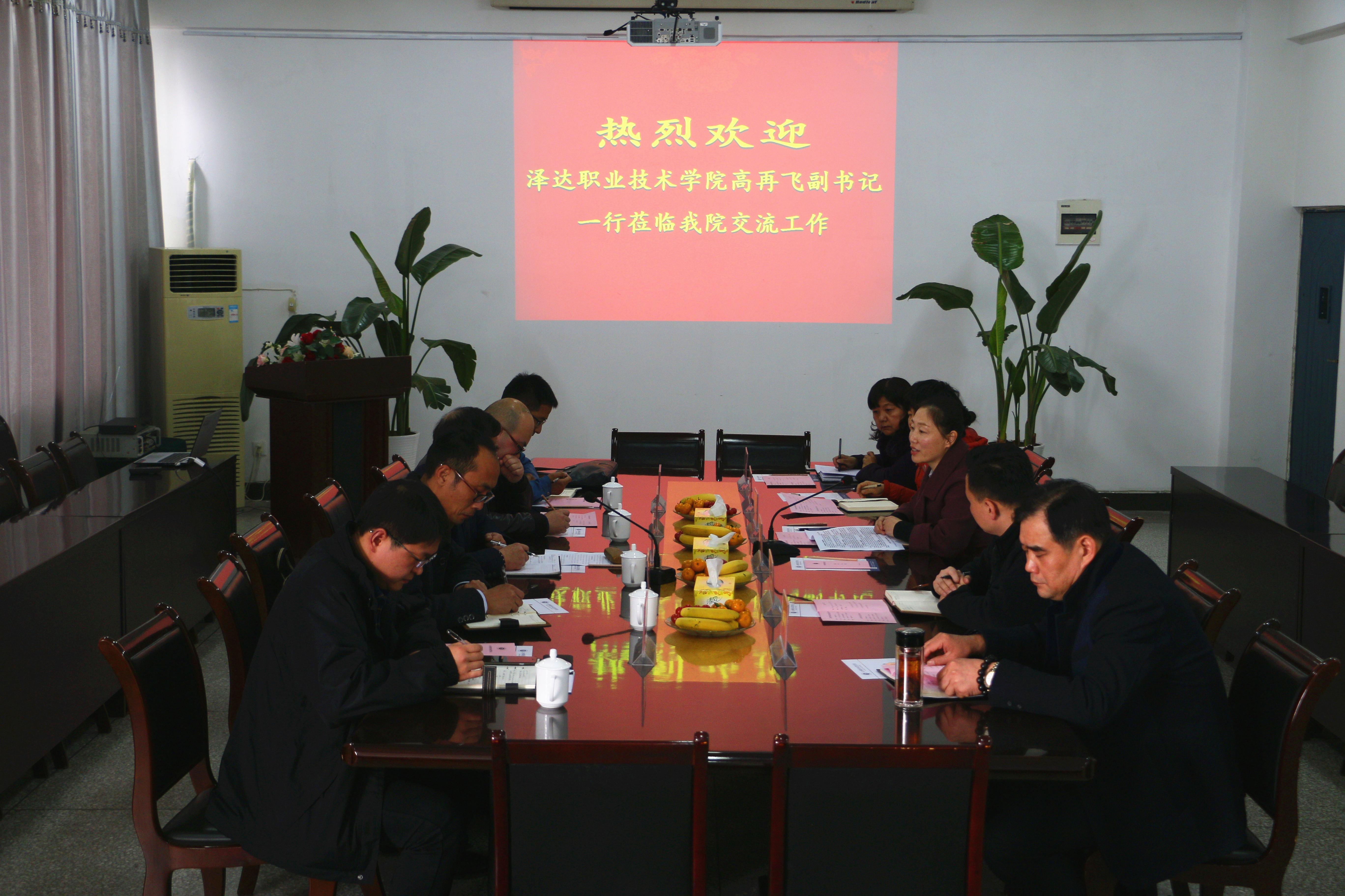 泽达职业技术学院党委副书记高再飞等对我院党建工作所在做的工作和取得的成效表示了赞赏,对他们在党建工作中遇到的一些困惑和难题进行了介绍,并就一些共同关心的问题进行了讨论,达成了共识。双方表示,应加强两校之间的交往与交流,共享党建工作成果。