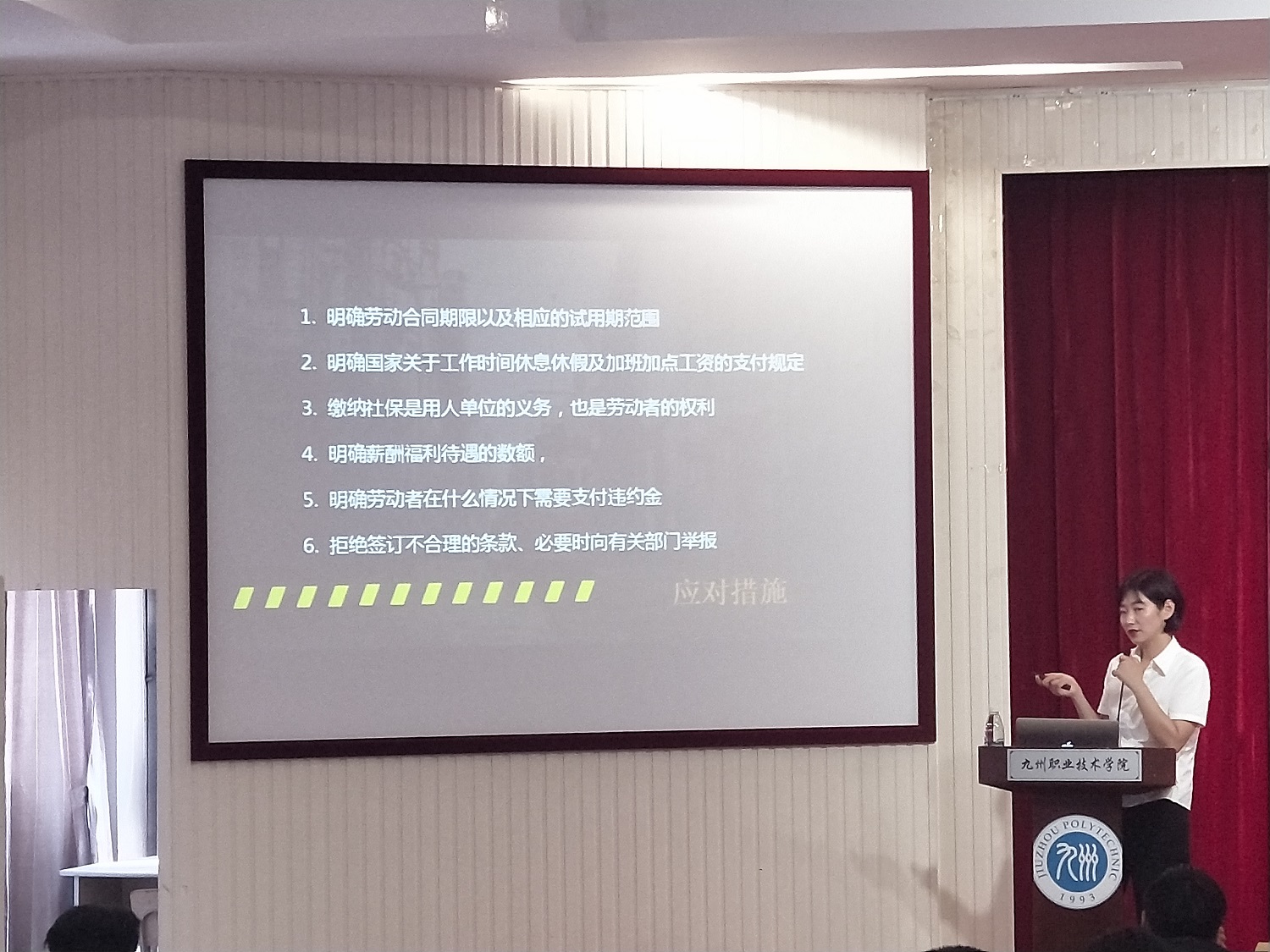 本次讲座,我们邀请到的是江苏智临律师事务所周玥律师。周律师执业以来,参与和处理大量民商事案件,具有丰富的实务经验,多年从事法律顾问工作和劳动法方向研究,协助劳动者、企业办理大量劳动法方向诉讼及非诉法律业务,具备扎实的法学知识基础。同时兼任徐州市总工会职工维权律师,对大学生的就业择业法律指导具有非常精确的针对性。周律师在讲座中,结合学生求职择业过程中常遇到的法律相关问题,用一个个生动具体的事例,从多方面给学生讲解了法律常识,以案释法,以法论事,深入浅出的给学生们做了生动的报告,告诉大家在日常的学习生活和今后的就业择业中,怎样识别用人陷阱,维护自身权益。讲座后,同学们积极与周律师互动, 咨询了很多与自身息息相关的法律问题。大家同时也表示,希望学校能够多组织此类的学习讲座,让同学们能够了解更多的课外常识,充实自己、充实大学生活。