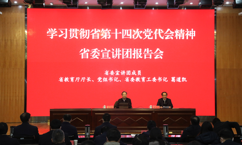 葛道凯围绕深刻领会和准确把握大会主题、过去五年的历史性成就、“争当表率 争做示范 走在前列”三大光荣使命、今后五年工作的总体要求和“六个显著提升”目标任务、九个方面重点工作、持续推进新时代党的建设新的伟大工程以及履行新使命、谱写新篇章“五个表率”的实践要求等方面,对省第十四次党代会精神进行了系统解读和深刻阐释,并就全省教育系统学习贯彻省第十四次党代会精神提出具体要求。