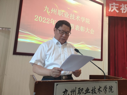 副院长杜蜀宾宣读了《关于表彰先进集体和个人的决定》(九州〔2022〕29号)。学院对今年以来在教学、学生管理和党建等方面表现突出的先进集体、先进个人进行表彰。