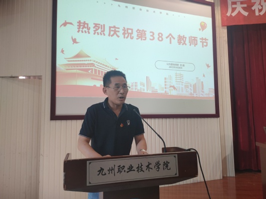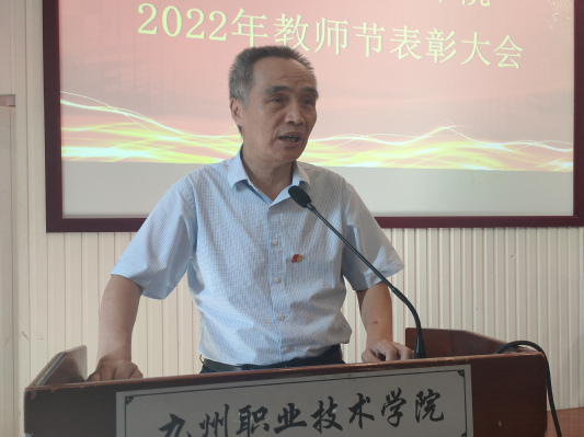 党委副书记、院长朱开永发表庆祝教师节讲话。他代表学院向辛勤耕耘在教学、科研、管理一线的教职工致以节日的问候和美好的祝愿;全面总结了过去半年学院在专业建设、教学管理、学生工作、校园疫情防控、校企合作产教融合、教师技能大赛、实验室建设、校园修缮工程、大学生就业、财务管理等10个方面取得的成绩;详细部署了下半年切实抓好党的建设、做好疫情防控工作、抓实专业群建设、推进产教融合,强化教师团队建设等重点工作。他要求,全体教职工要志存高远,做爱岗敬业的模范;要关爱学生,做教书育人的模范;严谨笃学,做终身学习的模范;自尊自律,做廉洁从教的模范,始终坚持“不忘初心使命,铸魂培根育人”,立师德,正师风,强师能,做人民满意的教师,以积极进取的精神风貌和教书育人的实绩,勇担培育时代新人的历史使命,以昂扬向上的精神面貌和立德树人的扎实行动,迎接党的二十大胜利召开。