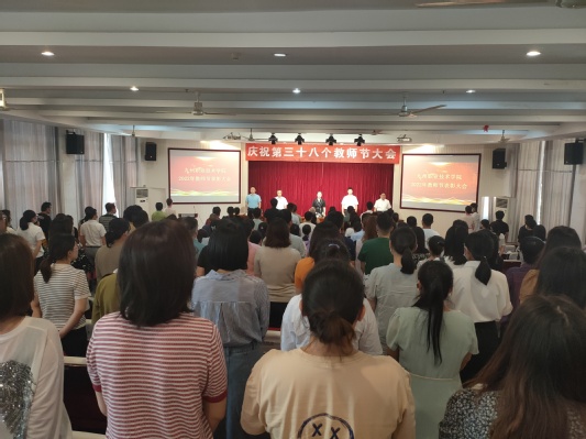 迎接党的二十大,培根铸魂育新人。9月8日下午14:30,我院在主南二报告厅举行庆祝教师节大会。全院教职工及学生代表欢聚一堂,共同迎接即将到来的第38个教师节。理事长侯新惠,党委书记吴永平,党委副书记、院长朱开永,副院长杜蜀宾,党委副书记、纪委书记张超出席大会并在主席台就座;学院创办人陈引亮应邀出席大会。大会由张超主持。