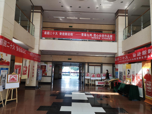 本次活动由党委宣传部、公共基础课部共同组织,面向全院师生征集优秀作品120余件,展出作品涵盖了剪纸、香包、泥塑等,媒介各异、风格不同,表现题材丰富多彩,展现了红色基因薪火相传,抒发了爱党爱国爱家情怀,唱响了新时代的主旋律,为党的二十大胜利召开营造良好氛围。这是九州师生向即将召开的党的二十大献上的一份特别礼物,喜迎党的二十大胜利召开!
