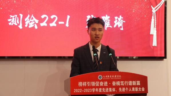 土木工程系测绘22班张雅琦同学代表先进个人发言。他结合自身情况向大家介绍了大学的学习生活经历,分享了作为学生干部的工作体会,以及想要成功必须洒下辛勤的汗水、细化目标制定合理的计划等经验做法。