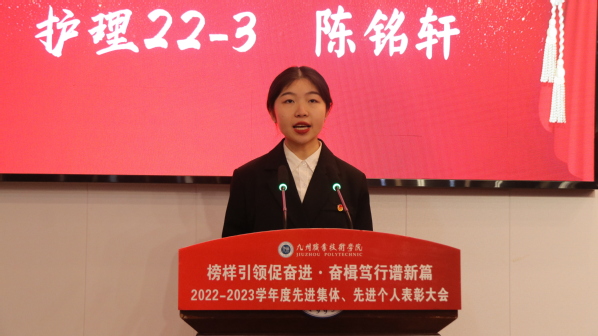 医疗与健康学院护理22-3班陈铭轩同学代表先进班集体发言。她从不同方面对班级学风班风建设进行了总结,分享了班级在建设优良学风过程中作出的努力,表达了“秉承‘诚信、自强、求实、创新’的校训,以时代发展与民族复兴为己任,敢想敢为又善作善成,让青春在全面建成社会主义现代化强国的火热实践中绽放绚丽之花”的决心。