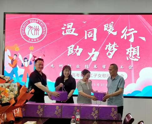 鹰击天风壮,鹏飞海浪春,一年一度的中考、高考即将来临。531日中午,我校举行“温暖同行 助力梦想”教职工子女中高考慰问座谈会,向家中有子女即将参加2024年中高考的18名教职工进行慰问,并送上“一举夺魁”手捧花、“事事高中”等礼盒。校长朱开永,党委副书记张超,工会副主席武艳,工会委员以及受慰问的18位教职工参加活动。