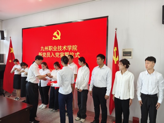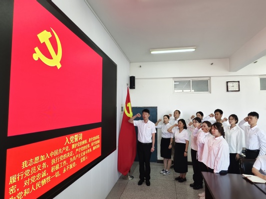 宣誓仪式在雄壮的《国际歌》中拉开序幕。在领誓人丁朋同志的带领下,所有新党员高举右手,向鲜红的党旗庄严宣誓,表达了为共产主义事业奋斗终身的决心。宣誓结束后,党委书记吴永平为新党员发放党徽。张雅琦同志代表新党员发言,承诺将铭记宣誓的神圣时刻,以实际行动践行入党誓词,以党员标准严格要求自己。