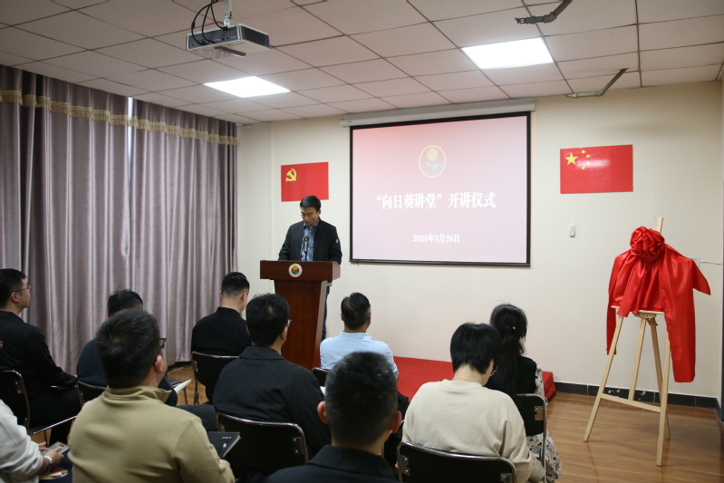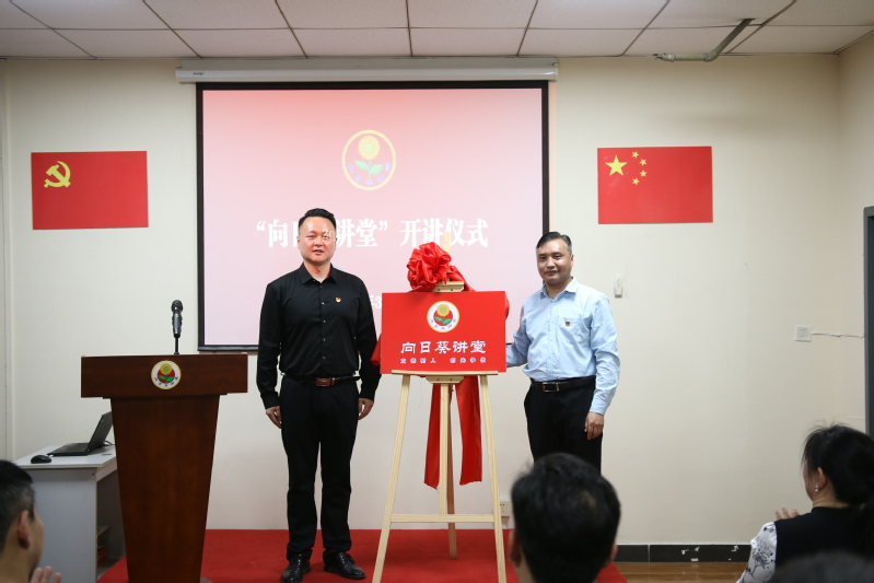 随后,进行揭牌仪式。党委副书记张超和党委委员、党委宣传部部长钱荣共同为“向日葵讲堂”揭牌。