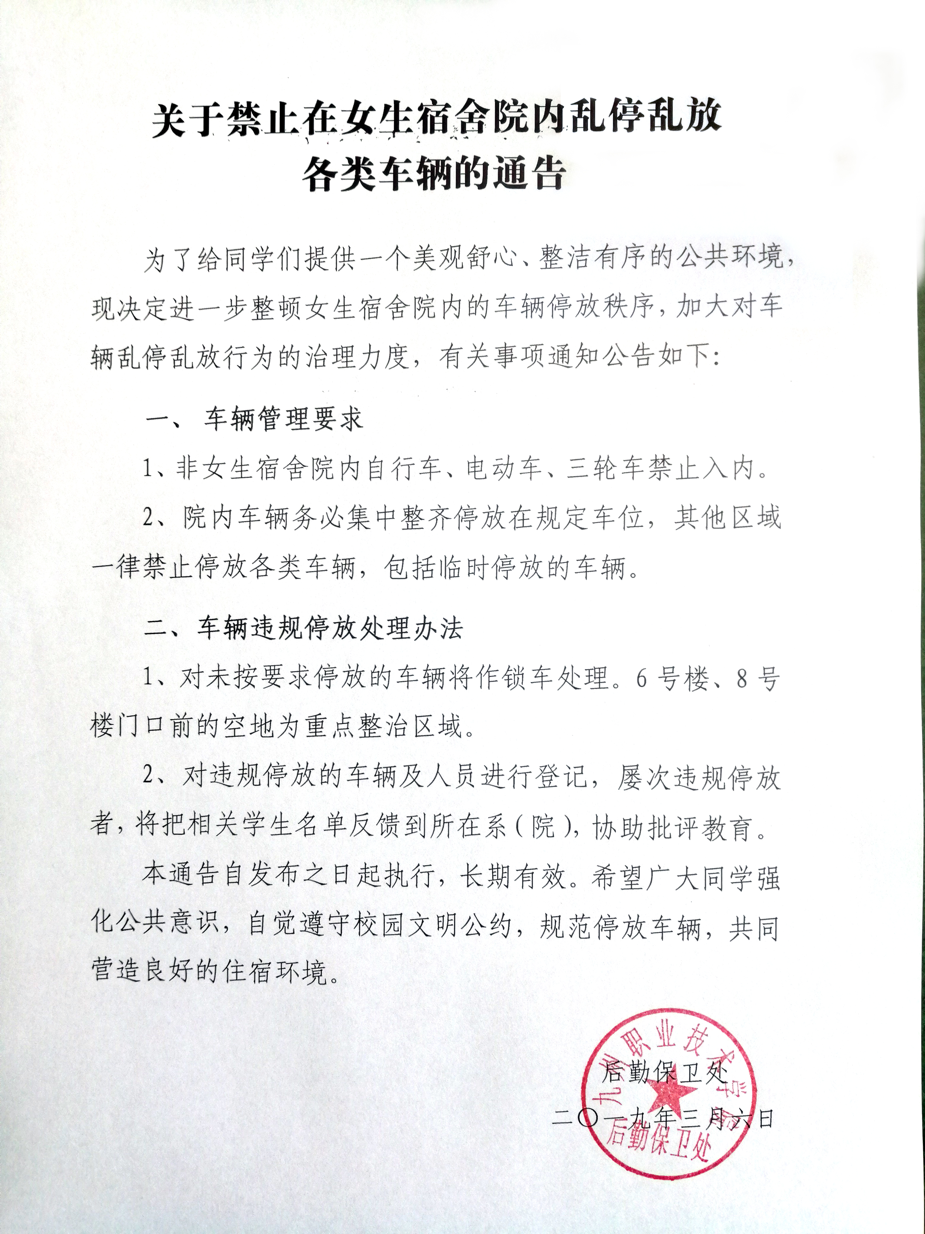 关于禁止在女生宿舍院内乱停乱放各类车辆的通告