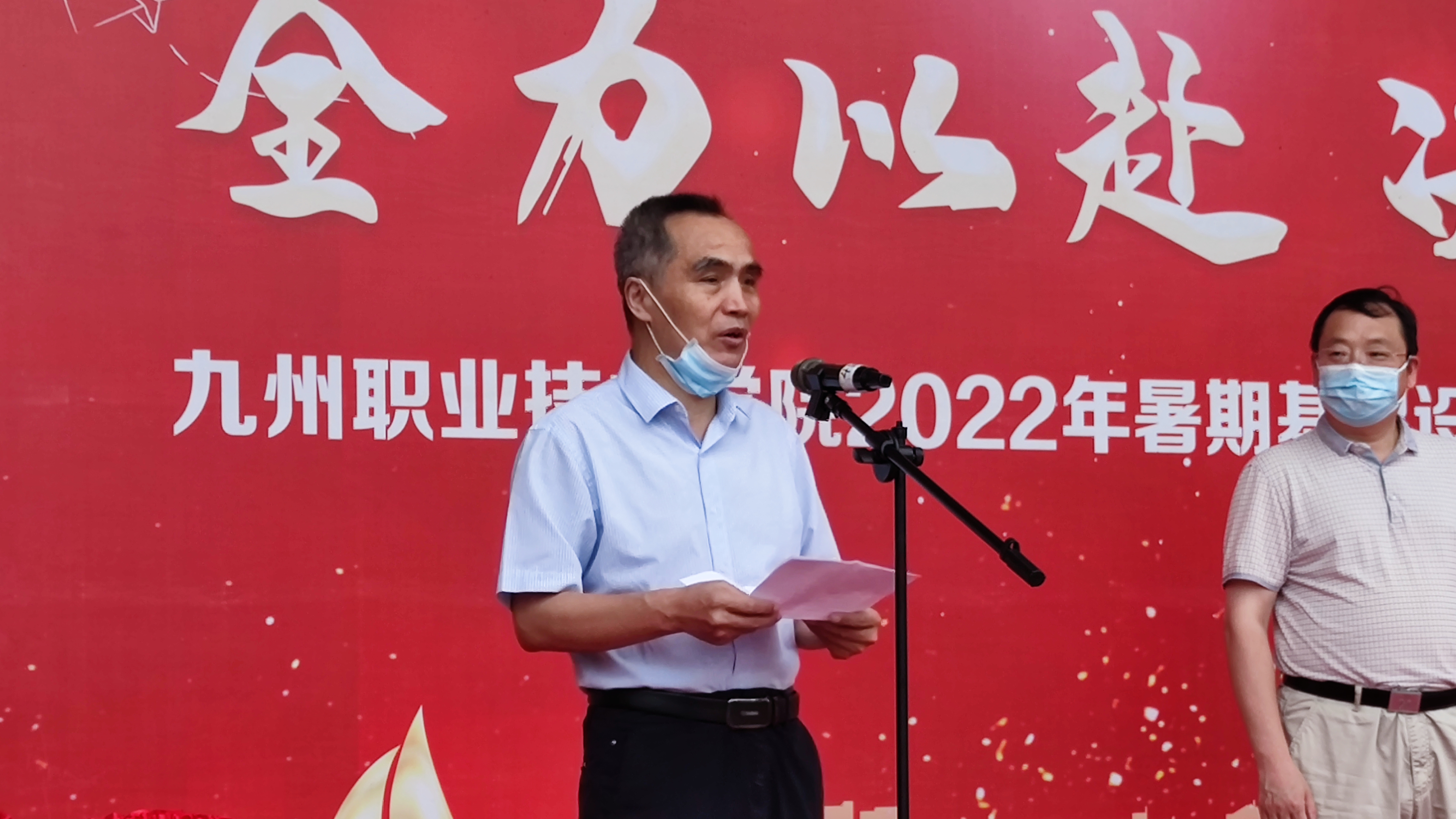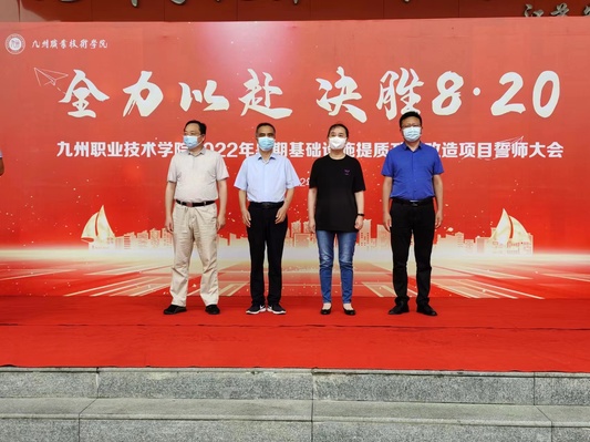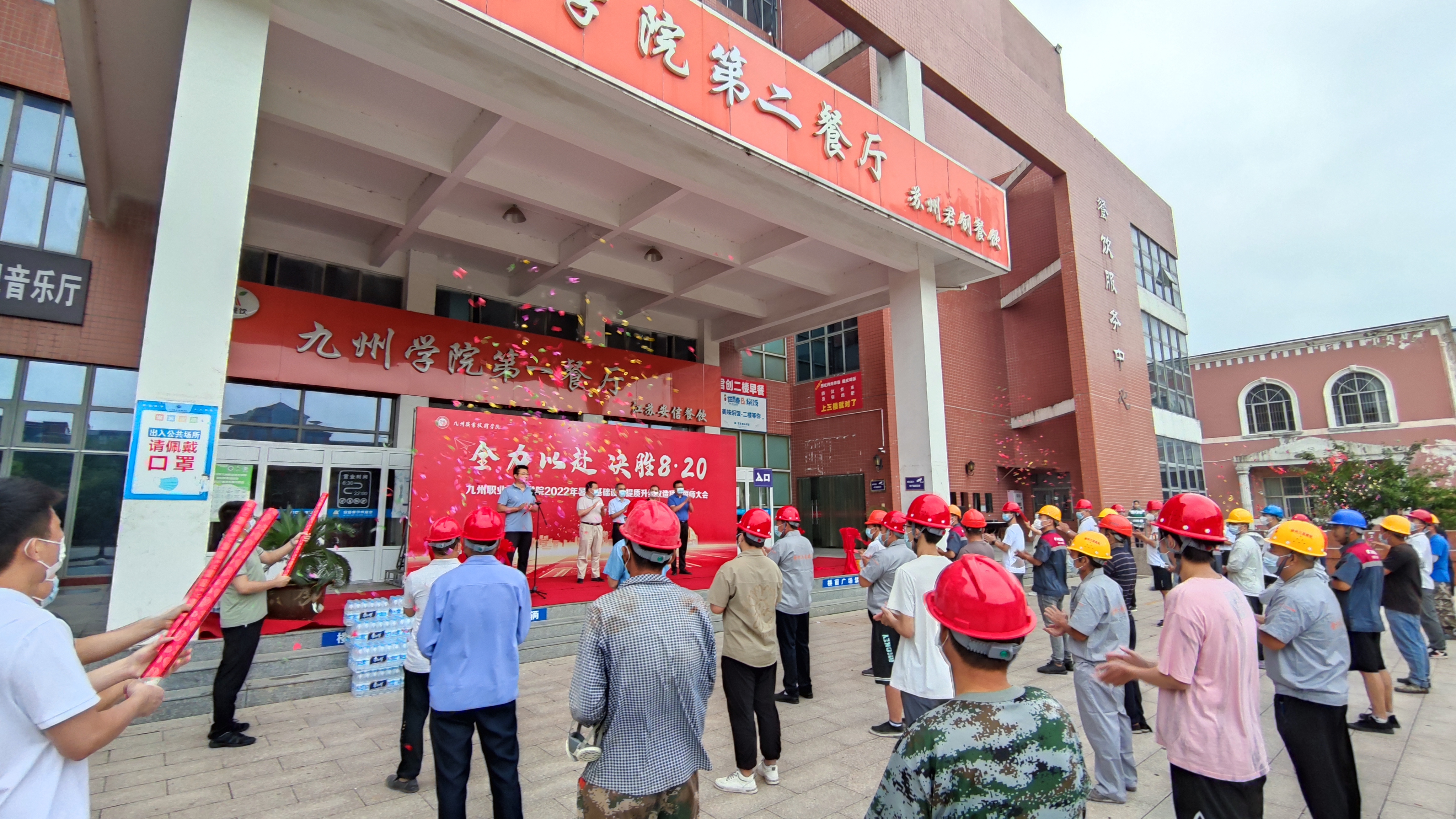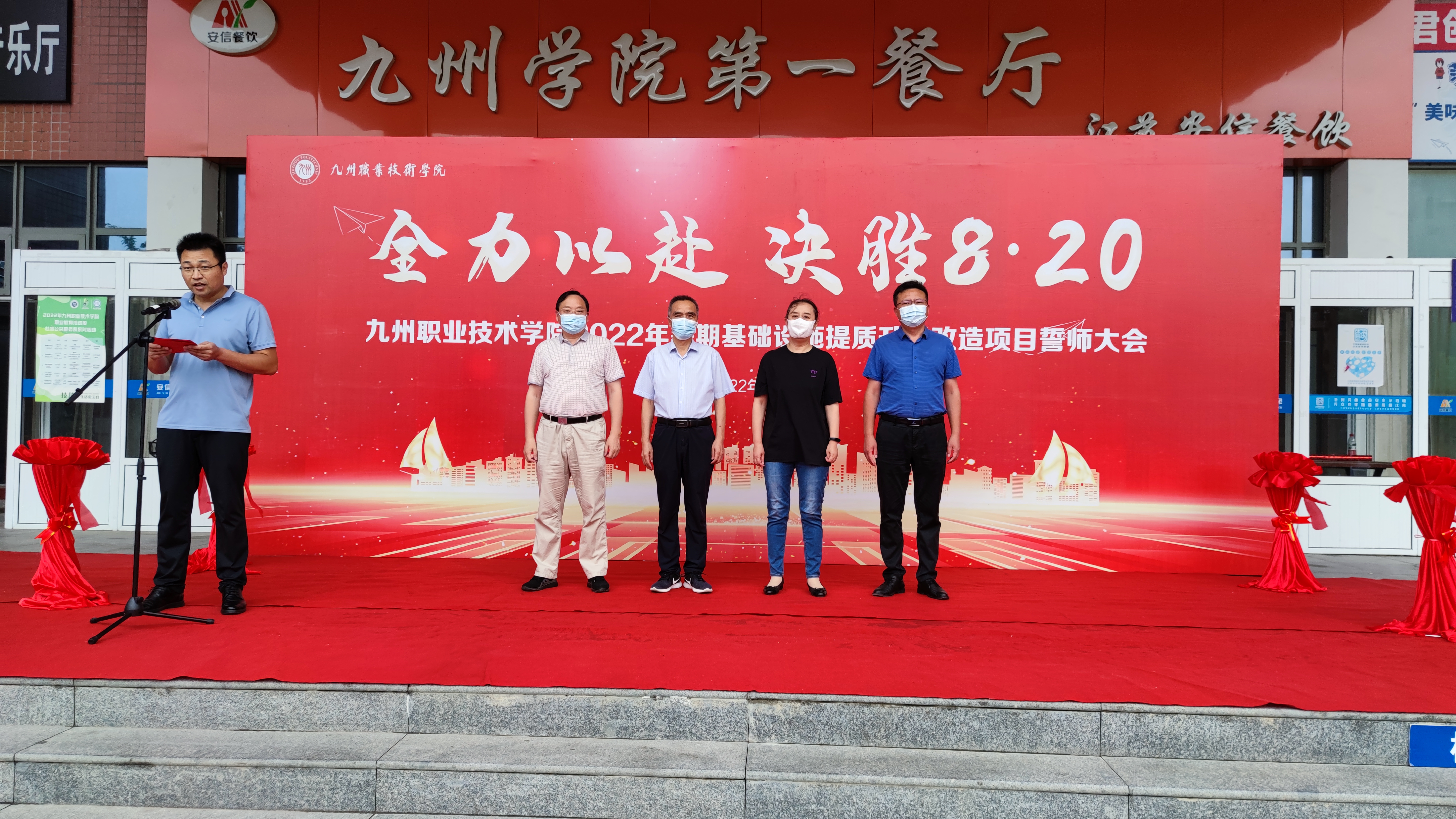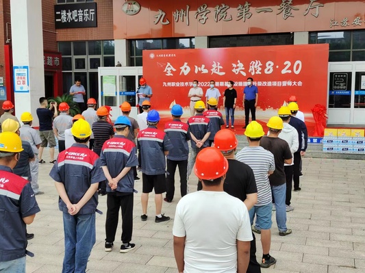 7月23日上午,学院在餐厅广场隆重举行2022年暑期基础设施提质升级改造项目誓师大会。理事长侯新惠,党委副书记、院长朱开永,理事会秘书长张道响,副院长曹振国出席活动,各承建单位工人代表、项目组教职工及总务处、党政办等相关单位负责人参加活动。活动由总务处牵头组织,李德才主持活动。