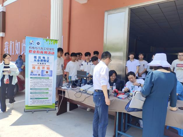 2024年是中华人民共和国成立75周年,是实现“十四五’规划目标任务的关键一年,为深入学习贯彻落实党的二十大精神:宣传展示我省职业教育改革发展成果,大力弘扬劳动光荣、技能宝贵、创造伟大的时代风尚,根据国家、省市有关部门对举办职业教育活动周的要求,机电与汽车工程学院于2024年5月17日中午在汽车技术实训中心门前举行了一场别开生面的《电工特色主题活动》。