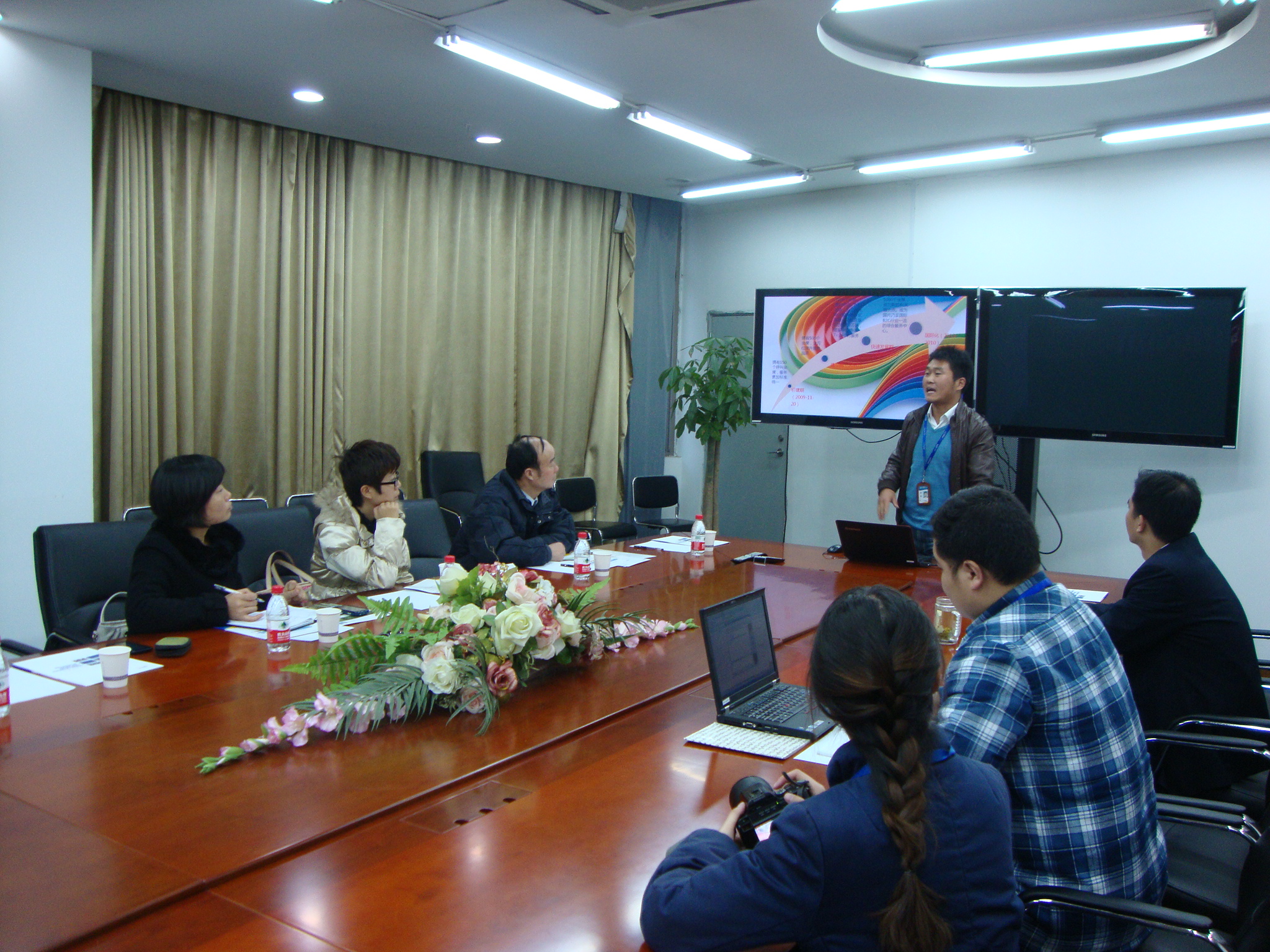 京东商城全国客服中心蔡经理介绍了京东商城的发展历程、京东三位一体的发展模式、员工职业发展之路等。人力资源部汪经理表示,九州学院已经有四批学生进入客服岗位实习,很多学生获得“黑马奖”,京东很愿意与九州学院合作。汪经理提到京东已在全国很多高校开始投资、已在江苏省三家大专院校投资建设了电子商务实验室,并介绍了京东商城与宿迁广播电视大学合作开设冠名班的经验。刘畅主任介绍了经管系开设的各专业,提出这些专业很适合与京东的合作。