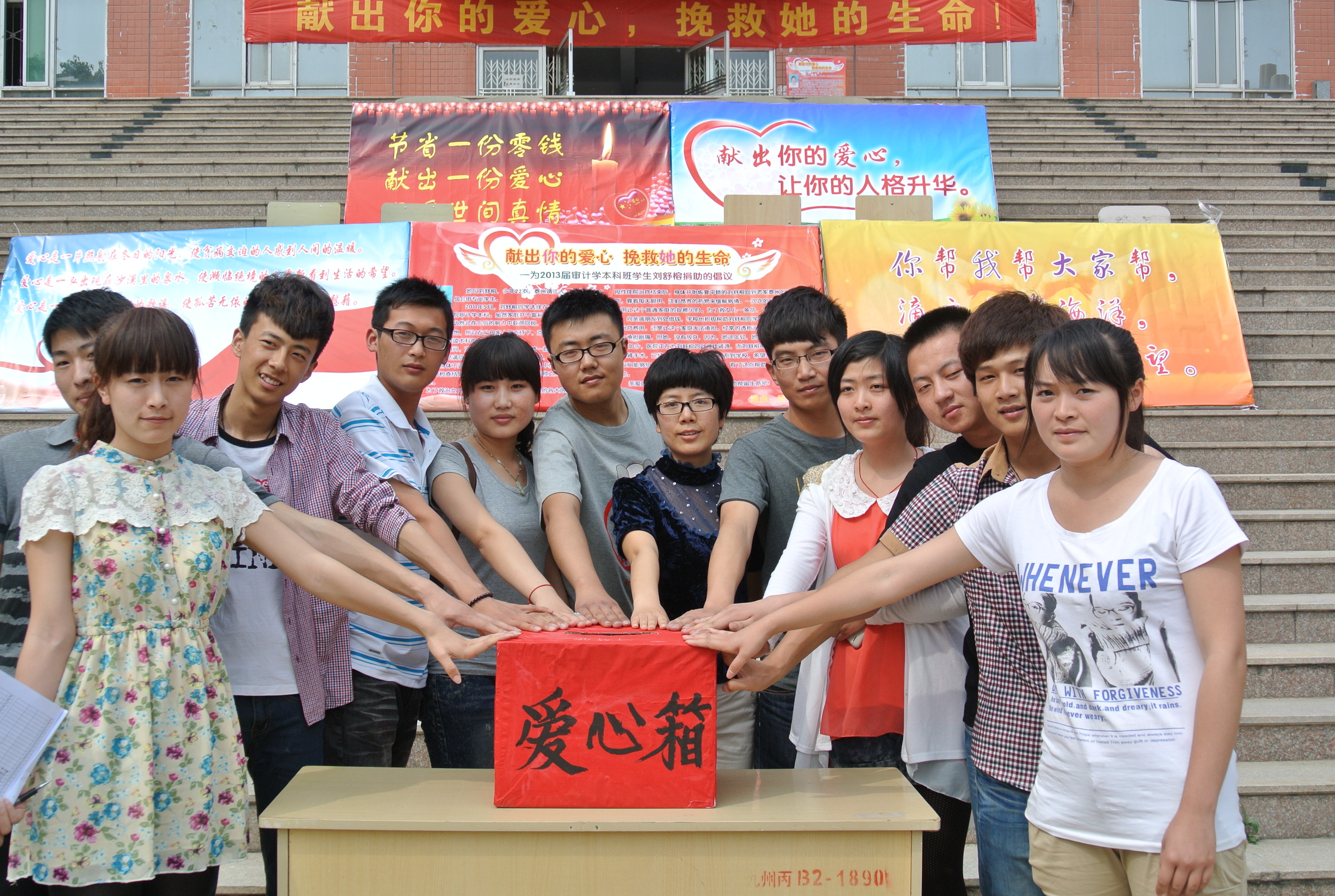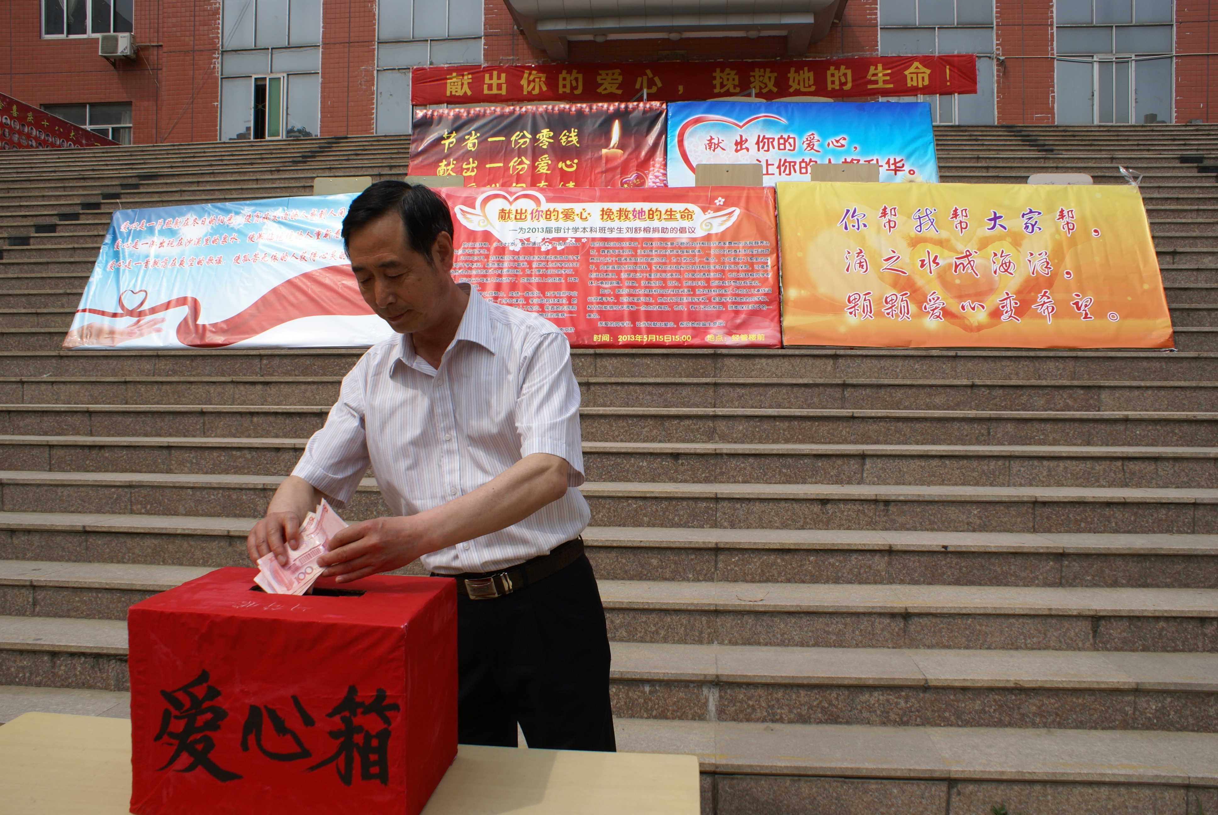 2013515中午,太阳成集团tyc234cc经济与管理系全体师生聚集在教1楼前举行了主题为“九州大爱,师生情深”——为审计学11级本科班学生刘舒榕同学换肾捐款活动的启动仪式。