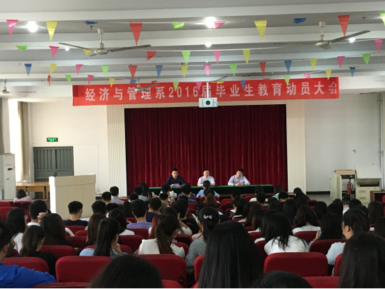为切实抓好经管系毕业生文明离校教育工作,加强对毕业生学生的服务和管理,2016年5月24日上午8点30分经济与管理系2016届毕业生教育动员大会在主南二如期召开。经管系主任张道响、教学主任冯之坦、行政主任朱存各及毕业生辅导员携全体毕业生参加了会议。