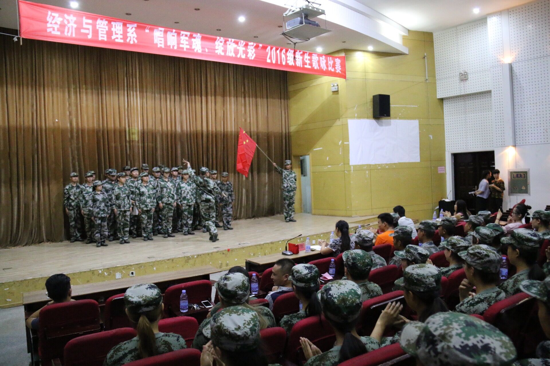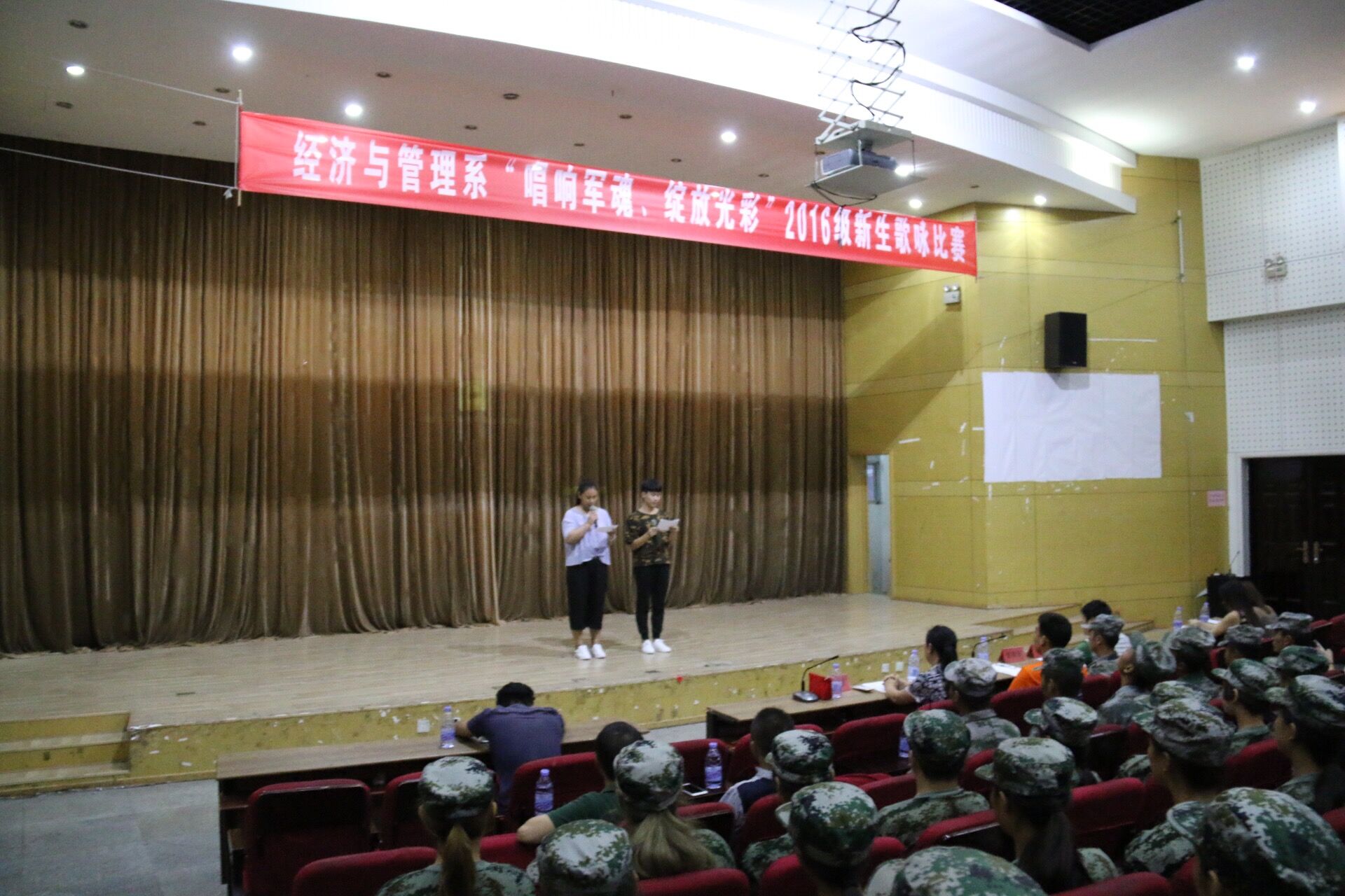 9月9日晚18点30,经济与管理系2016级新生军训歌咏比赛在我校报告厅举行宁。经济与管理系辅导员王洁老师、张天星老师,2016级班主任单青州老师、姜大从老师、钱荣老师,以及经济与管理系行政副主任朱存各、三营全体教官出席了此次活动。