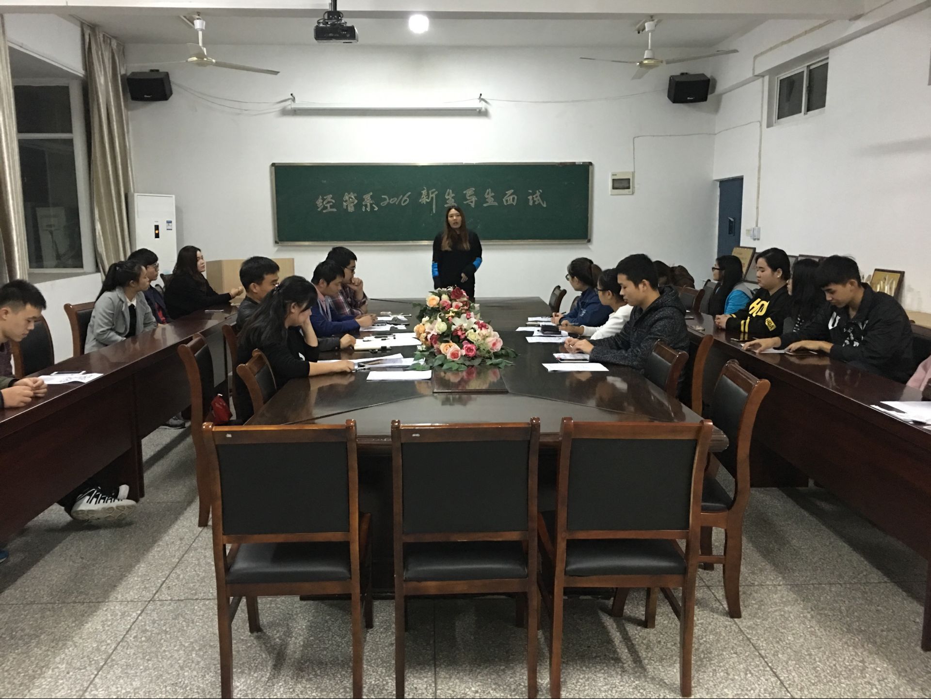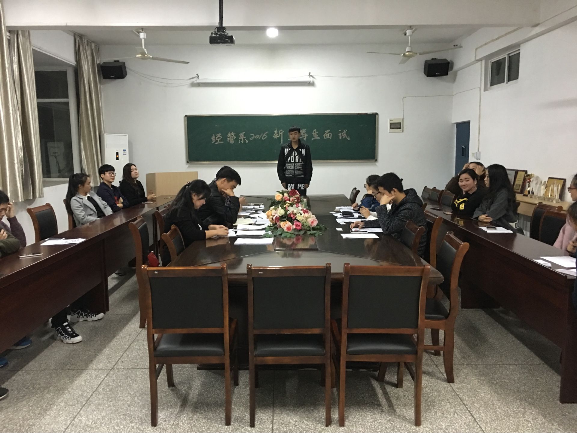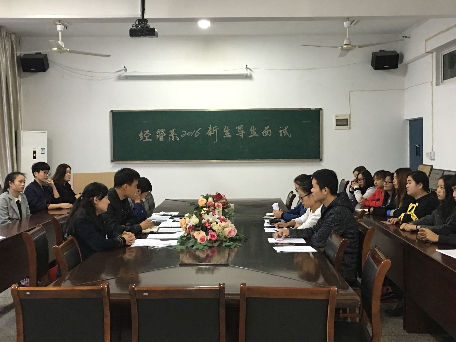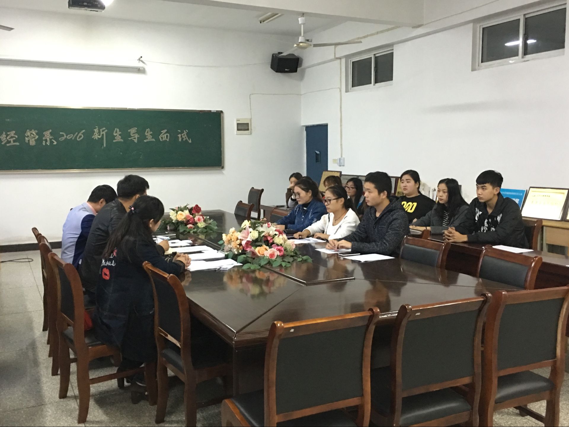 经济与管理系2016级新生导生面试于2016年10月23日晚17点在经管系会议室主704成功举行,此次面试的评委有经管系行政副主任朱存各老师、经管系团委副书记马跃老师、辅导员王洁、张天星老师以及辅导员助理代表王永志、胡苏燕和万慧同学,来自经管系2015级的20多名同学参加了面试。