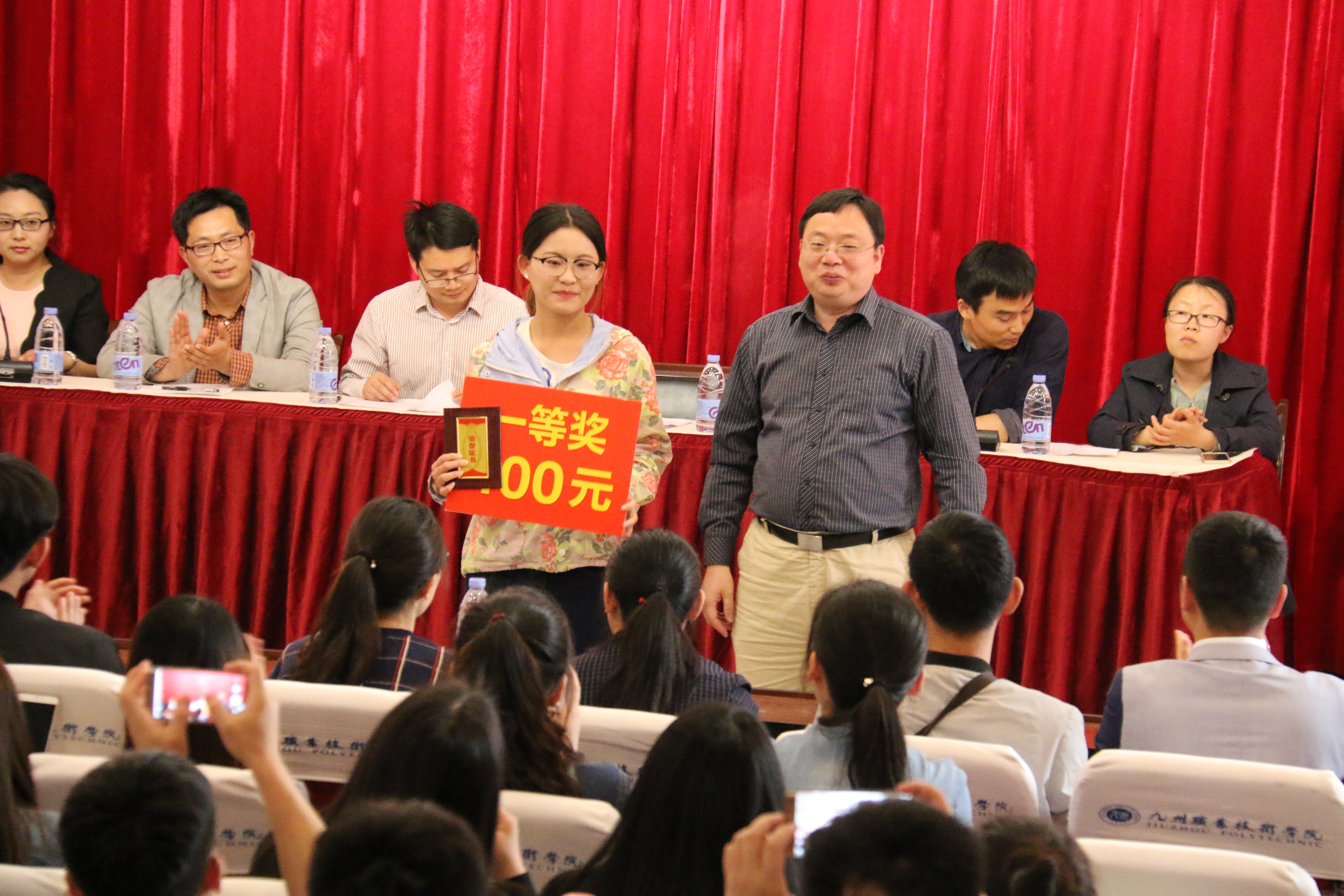 第三由教师代表刘永伟老师发言,对于此次在江苏省教育厅主办的高职院校“中教畅享杯”电子商务和市场营销技能比赛中,代表九州学院取得全省二等奖和三等奖的好成绩,一些经验和体会分享给大家。一、成绩来自不厌其烦的反复实践。二、团队凝聚力和良好的沟通是关键。三、通过比赛坚定了目标,把创新发展走的更加坚实。