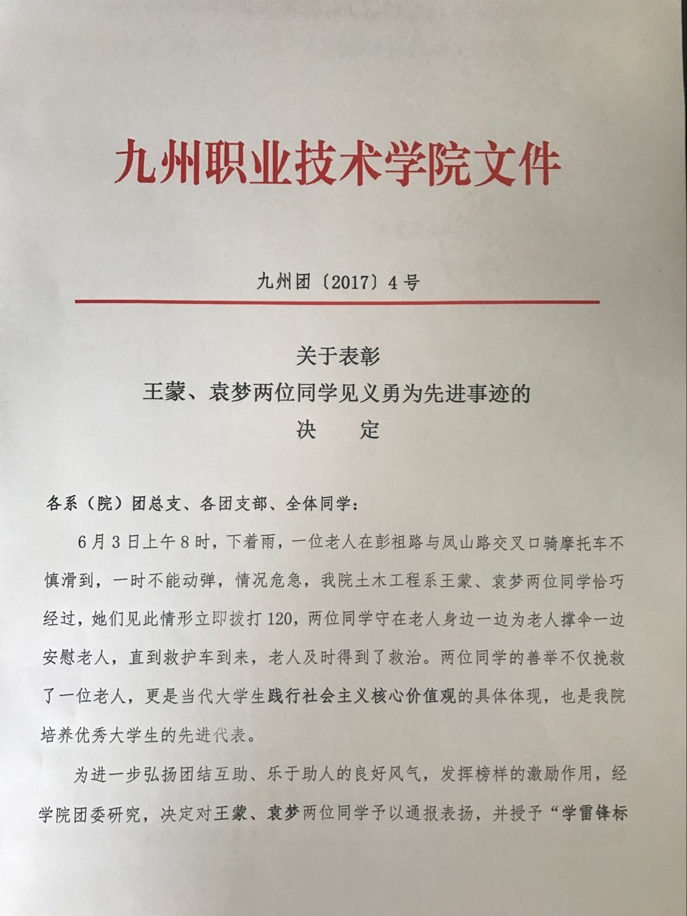 关于表彰王蒙、袁梦两位同学见义勇为先进事迹的决定
