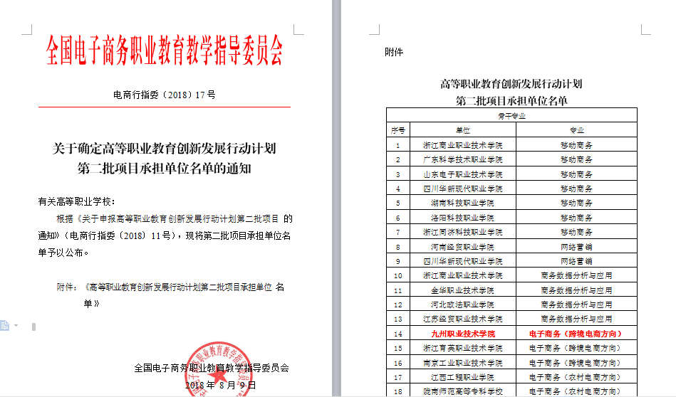 近日从全国电子商务职业教育教学指导委员会文件获悉,由高职学院电商分院申报的电子商务(跨境电商方向)项目获批高等职业教育创新发展行动计划第二批项目“骨干专业建设”立项。这是我院电子商务专业获批的首项高等职业教育创新发展行动计划立项。据了解,全国电子商务职业教育教学指导委员会制订的《<教育部高等职业教育创新发展行动计划(2015—2018年)>实施方案》,旨在提升全国电子商务职业教育教学指导委员会的行业指导能力,持续提高电子商务职业教育发展质量,增强电子商务职业教育服务国家战略能力。