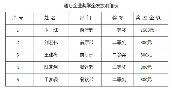 12月18日“中油泰富”奖学金颁奖仪式在张家港中油泰富国际酒店隆重举行。奖学金以酒店各级领导层层评选的方式,评出太阳成集团tyc234cc酒店2018班优秀实习生5人,分别是一等奖1人(1500元/人),二等奖4人(800元/人),奖励金额共计4700元。