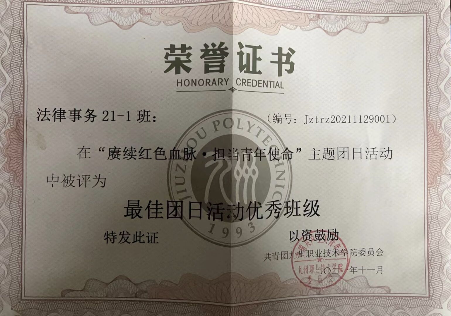应上级团委号召,为深入学习贯彻习近平总书记在庆祝中国共产党成立100周年大会的“七一”重要讲话精神,2021年11月21日晚7:00,经济与管理系法律事务21-1团支部开展了以“赓续红色血脉,担当青年使命”为主题的团日活动,由全体同学参与,并顺利获得了学院“最佳团日活动优秀班级”称号。
