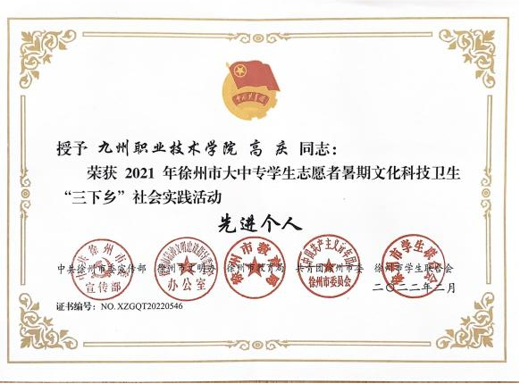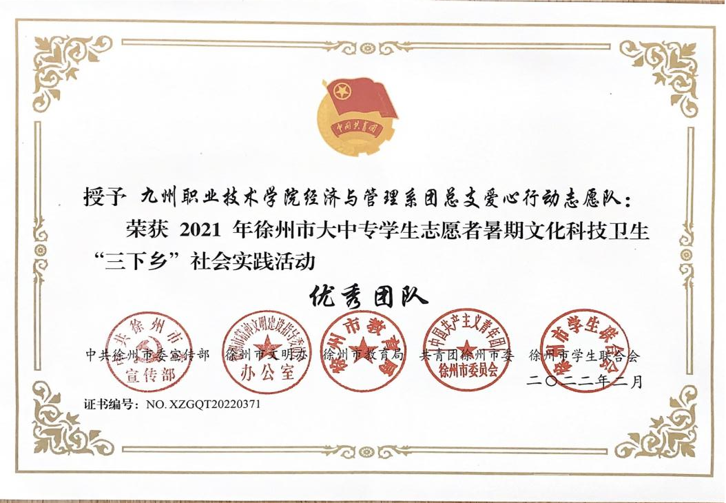 近日,2021年徐州市大中专学生志愿者暑期文化科技卫生“三下乡”暑期社会实践活动获奖结果相继揭晓。在“三下乡”社会实践活动总结通报工作中,经济与管理系“爱心行动愿队”荣获优秀团队称号。经济与管理系团总支书记李成军老师荣获“先进工作者”荣誉称号。团队成员高庆、王晚行同学荣获“先进个人”荣誉称号。
