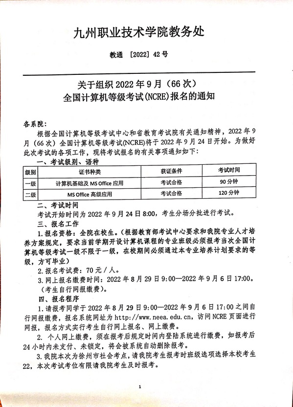 关于组织2022年9月(66次)全国计算机等级考试(NCRE)报名的通知