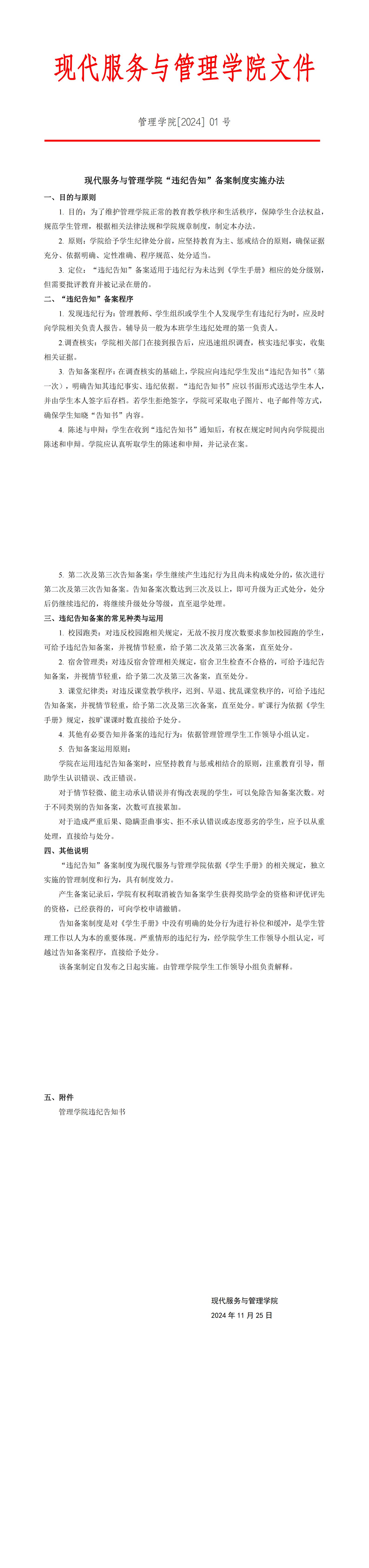 现代服务与管理学院“违纪告知”备案制度实施办法