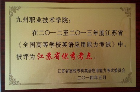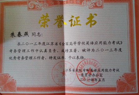 为在全省范围内建设良好的考风考纪,营造良好的考试环境,进一步做好全省高等学校英语应用能力考试的考务工作,江苏省教育厅和省高校专科英语应用能力考试委员会于2014年5月28日对全国高等学校英语应用能力考试江苏省考区优秀考点和优秀考务工作者进行表彰,我院荣获2012至2013年度优秀考点,教务处朱春燕老师被评为“优秀考务管理工作者”。