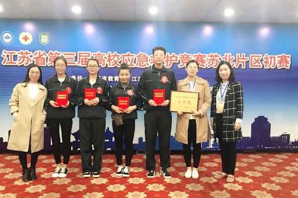 2017年10月18日,社会公共服务系康复16级四名学生:王蝶,张仲秋,魏玉瑶,邢皓然,在时景老师,李明雪老师的指导下,由系教学副主任苏倩倩的带领,参加了在扬州举办的江苏省第三届高校应急救护竞赛苏北片区初赛,并获得了团体二等奖的优异成绩。