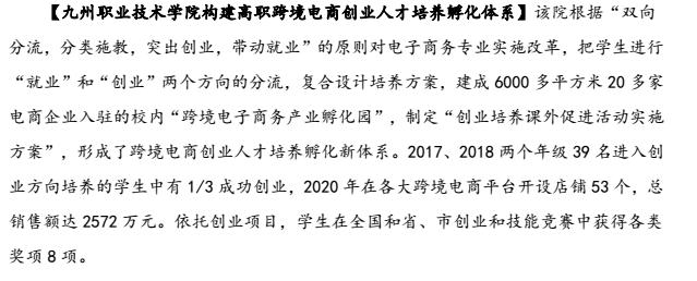 据日前公布的《江苏省高等职业教育质量年度报告(2022)》(电子版),我院人才培养工作一项典型案例成功入选。在报告第二部分“学生发展”的“创新创业”栏目中,我院提供的“构建高职跨境电商创业人才培养孵化体系”作为江苏高等职业院校“创新创业教育实践”的典型案例得以推广介绍。