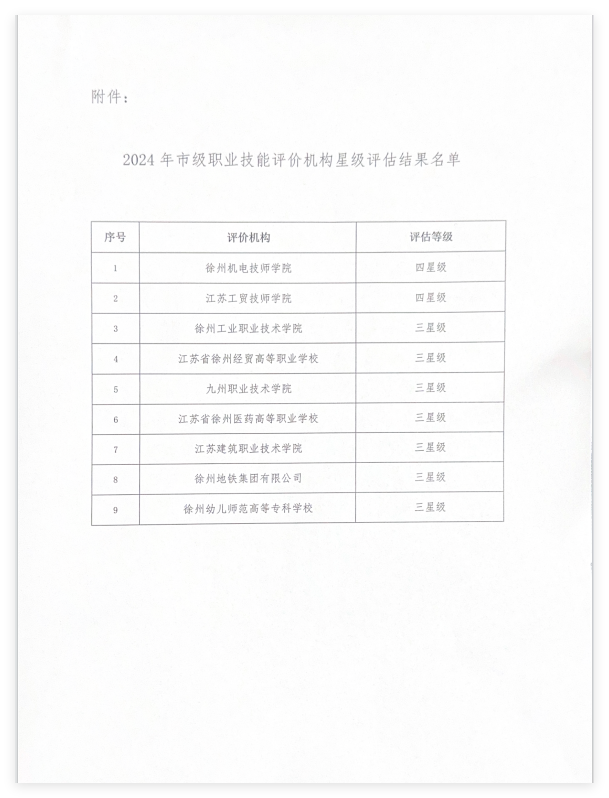 近日,徐州市人力资源和社会保障局公布了“2024年市级职业技能评价机构星级评估结果”,我校荣获“三星级评价机构”称号。