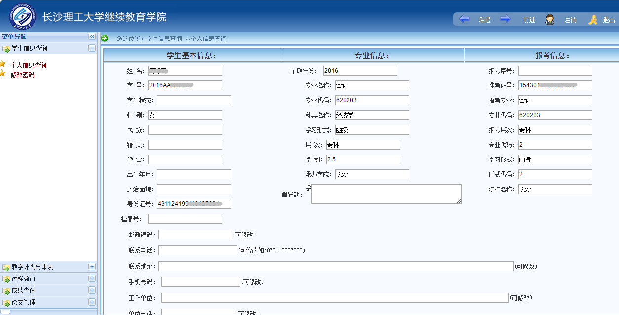 重要信息如身份证号、准考证号、专业信息等不能修改,如发现错误,请报告函授站管理员。