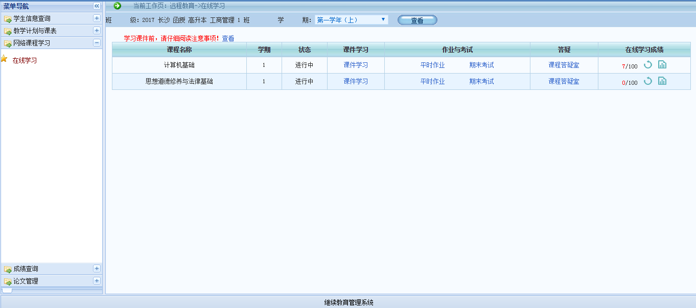 开通了网学的课程,学生可以在线进行课件学习、在线做题、在线考试。以下是学生在线学习的首页面: