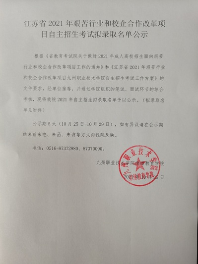 江苏省2021年艰苦行业和校企合作改革项目自主招生考试拟录取名单