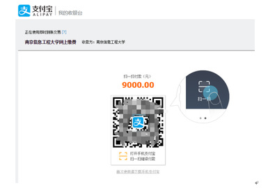 6. 选择支付途径后,系统将引导您到相应的网上支付平台进行支付,进入下图界面,通过手机支付宝扫一扫完成缴费。