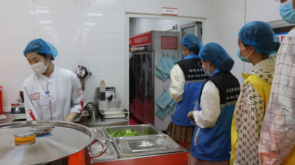 本次活动主要采取实地查看的方式进行。参与代表们在充分学习食品安全防护要求后,统一穿戴防护服,在食堂工作人员的带领下,深入仓库、洗菜间、切配间、操作间、48小时留样冰箱、洗消间等重点区域参观查看,详细了解了食品原料采购、食品贮存、生产加工、食品留样、清洗消毒、餐厨废弃物处置、员工管理等方面的工作以及食品安全管理机制落实情况;现场查阅了健康监测、索证索票、出入库登记、食品留样、消毒记录、试尝陪餐记录及“日管控、周排查、月调度”台账等过程管理资料;对学校食堂的安全管理、菜品质量、用餐环境、服务水平等方面工作进行现场提问。食堂工作人员认真听取了代表们的意见和建议,对提出的问题进行了积极回应。