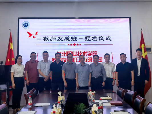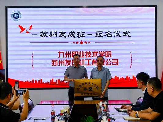 授牌仪式上,校企双方深入座谈交流,在人才培养、项目合作、实习就业、产业服务以及学生就业等方面达成了一致意见,纷纷表示将以此次为契机,加快“产”“学”“研”的深度融合,努力实现宽领域、高层次的合作。随后,在与会人员的见证下,举行了“苏州友成冠名班”授牌仪式。