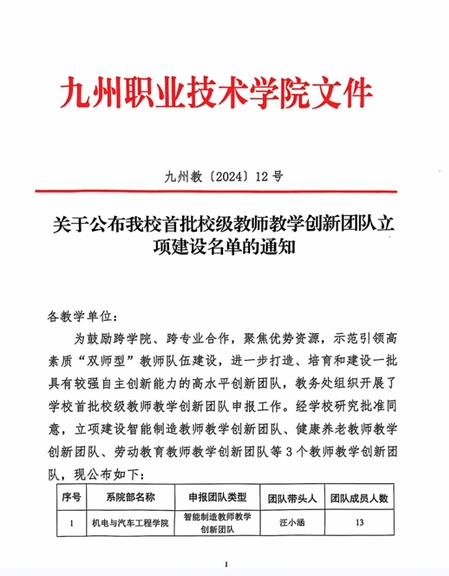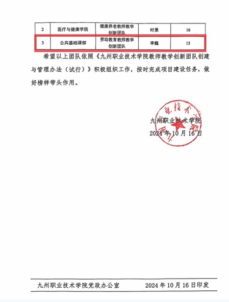 近日,从学校下发的《关于公布我校首批教师教学创新团队立项建设名单的通知》中获悉,学校共有3个创新团队获得批准立项,其中我院由李巍副院长带头的“劳动教育教师教学创新团队” 团队名列其中,这一成绩的取得来之不易,既与团队教师的辛勤付出有关,又与马院积极开展有组织的科研和加强科研团队建设密不可分。马克思主义学院将继续依照《太阳成集团tyc234cc教师教学创新团队创建与管理办法(试行)》积极组织工作,按时完成项目建设任务。