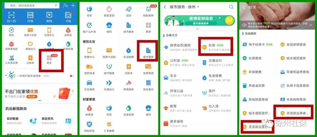 个体灵活就业参保人员每月6日至月底,可采取多种方式自助缴纳社保费:一是“支付宝”缴费:打开“支付宝”手机APP—城市服务—社保—灵活就业养老缴费/灵活就业医疗缴费—输入身份证号即可缴费;二是“徐州人社” 缴费:打开“徐州人社”手机APP—灵活就业人员缴费—灵活就业人员养老缴费/灵活就业人员医保缴费-输入个人编号或身份证号即可关联支付宝或银行卡缴费;三是网上银行缴费,登录交行、工行、建行网上银行缴费。