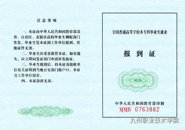 毕业生凭与用人单位签定的《协议书》办理《就业报到证》。报到证由蓝色上联、白色下联组成,是毕业生办理户籍迁移,到工作单位报到的凭证。上联(蓝色)交报到单位,下联(白色)由学校存入学生本人档案。就业报到证相当重要,许多相关的手续和环节都需要报到证作为凭证才能办理,如户口迁移、转正、提职、岗位变动等,因此报到证一定要妥善保管,谨防遗失。